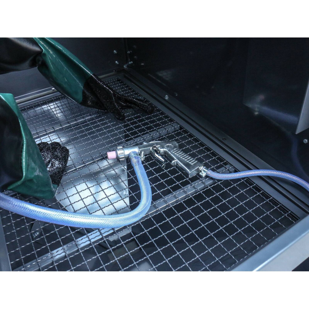 * Blast rust, corrosion and paint on large parts in a enclosed cabinet to keep dust off the floor and out of the air.