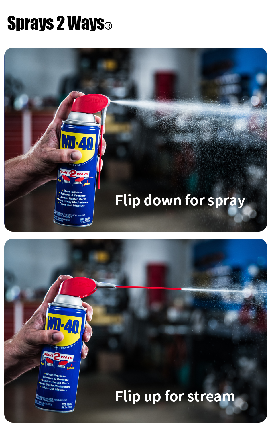 382ml SMART STRAW - NEVER LOSE THE STRAW AGAIN WITH WD-40 SMART STRAW. It features a permanently attached straw that sprays two ways. Simply flip it up for a precision stream and down for a regular spray action.