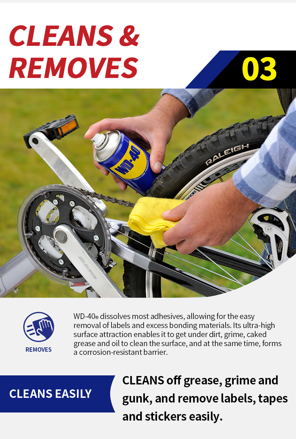 WD-40® Multi-Use Product protects metal from rust and corrosion, penetrates stuck parts, displaces moisture and lubricates almost anything. It even removes grease, grime and more from most surfaces.