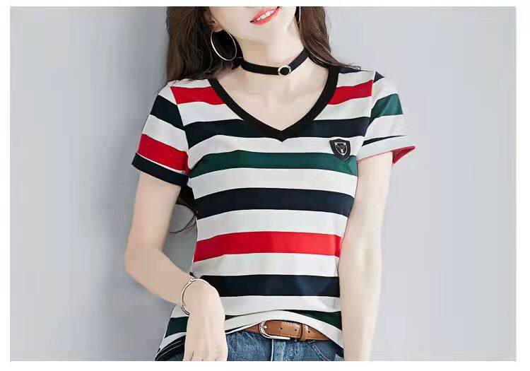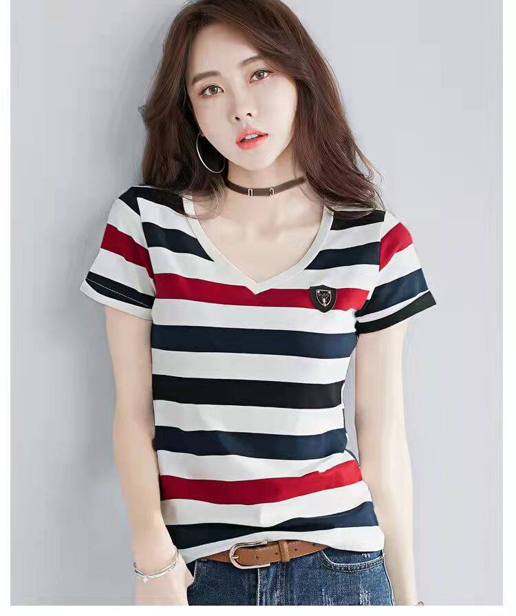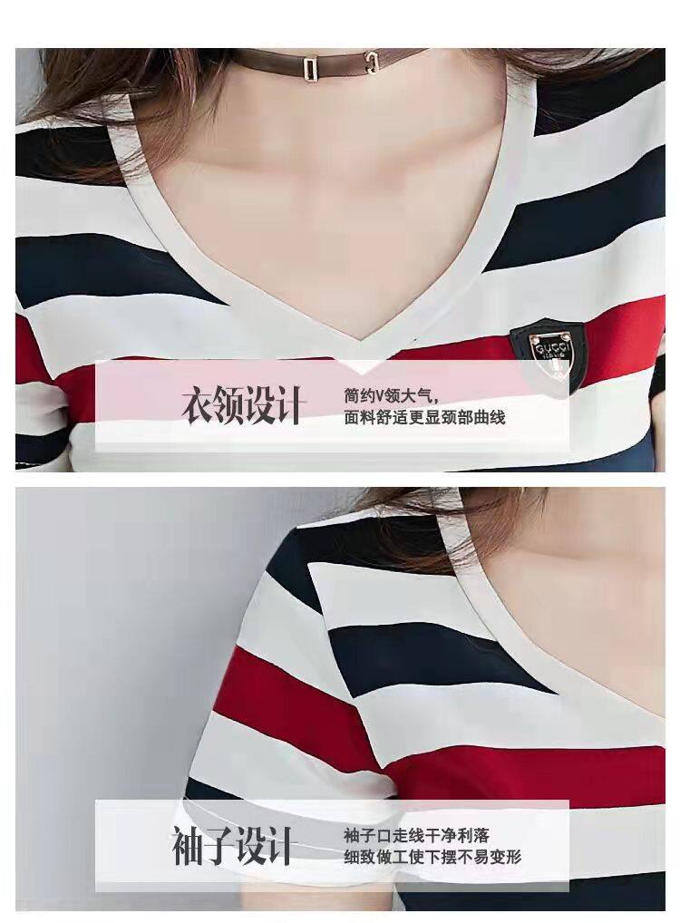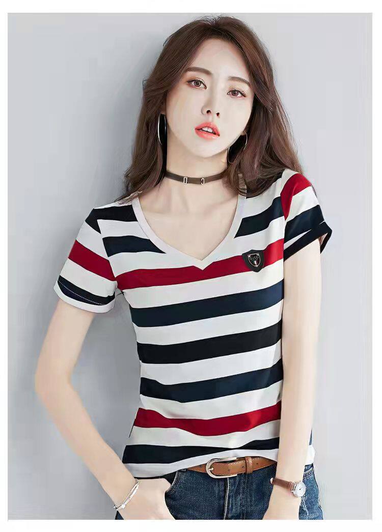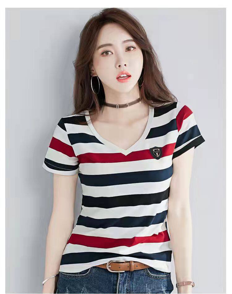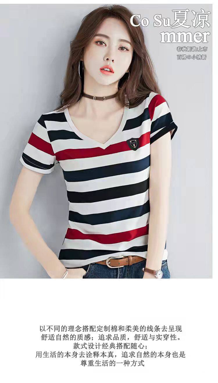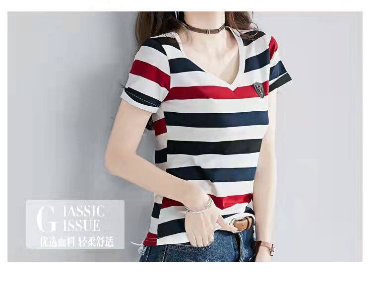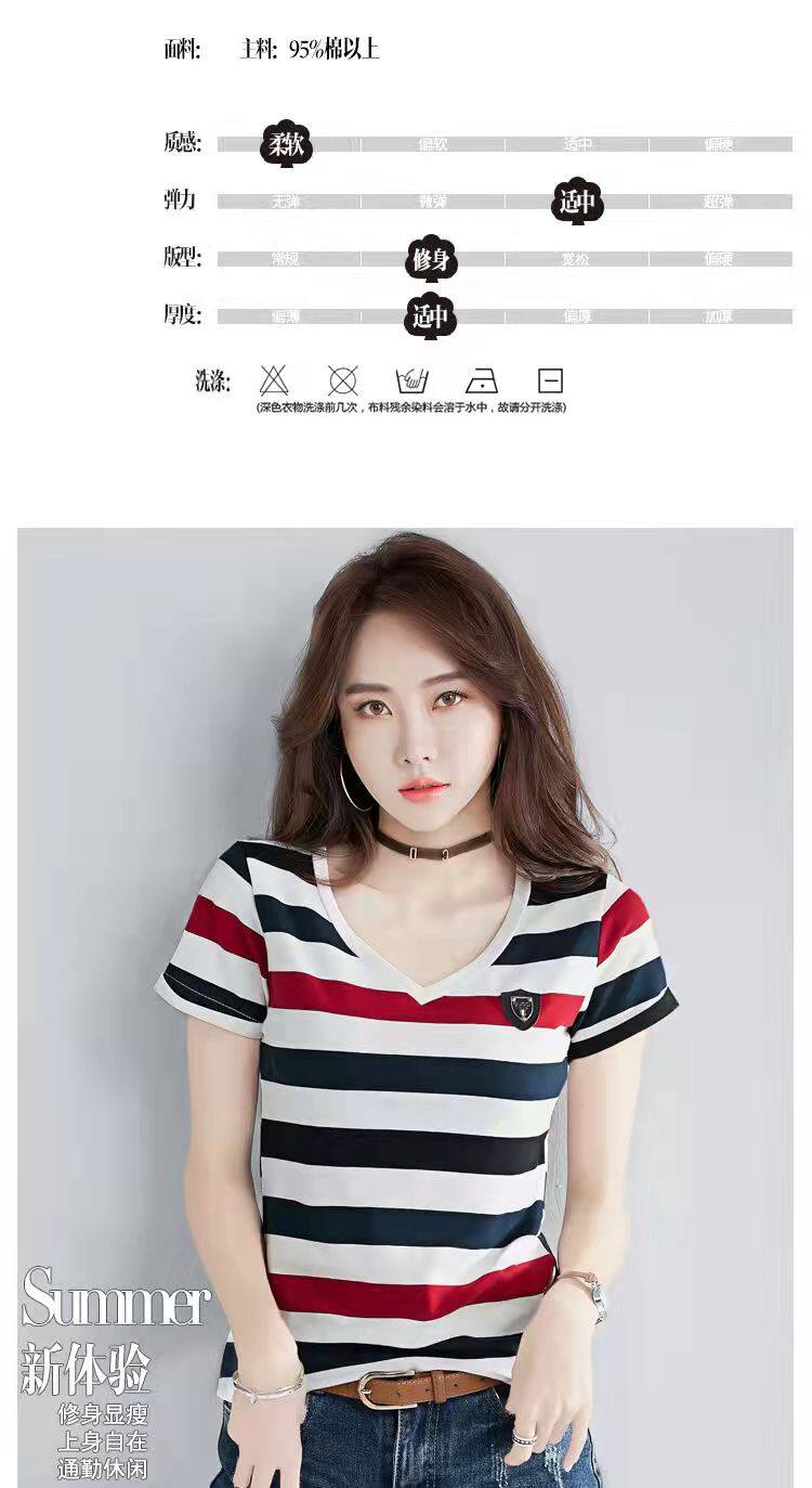 100%全棉韩国新款时尚女士全棉短袖条纹T恤女士修身大码V领半袖T恤夏季上衣