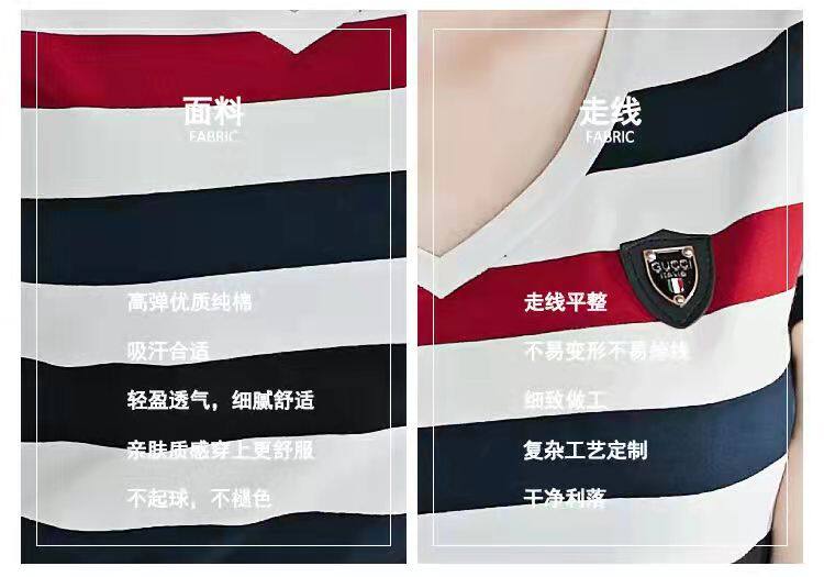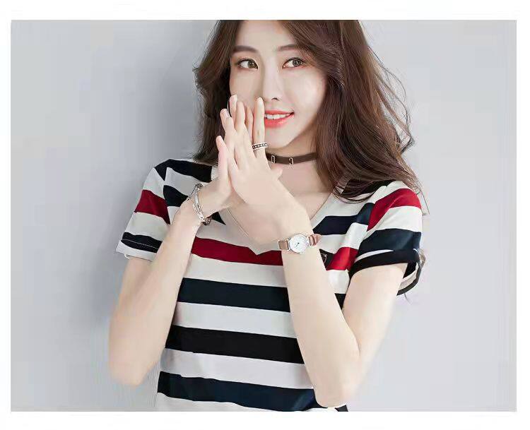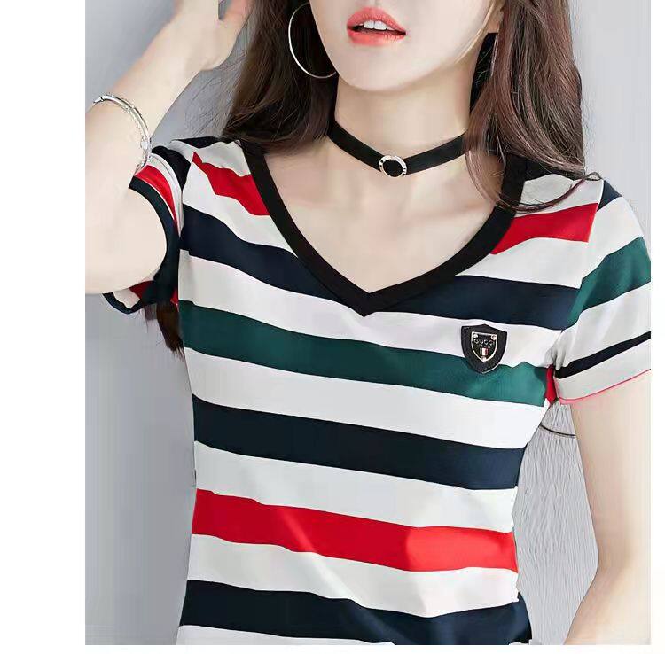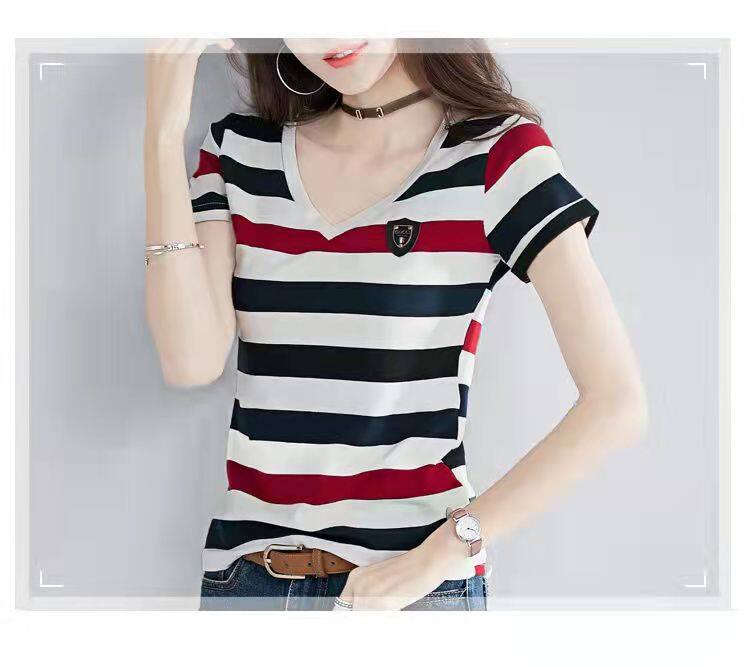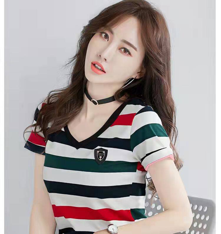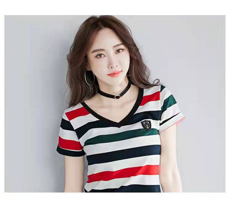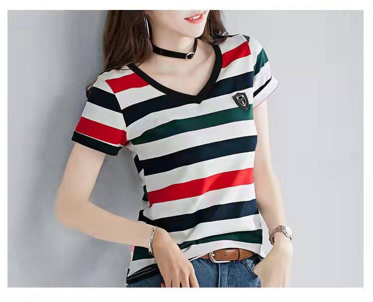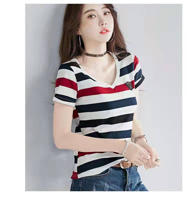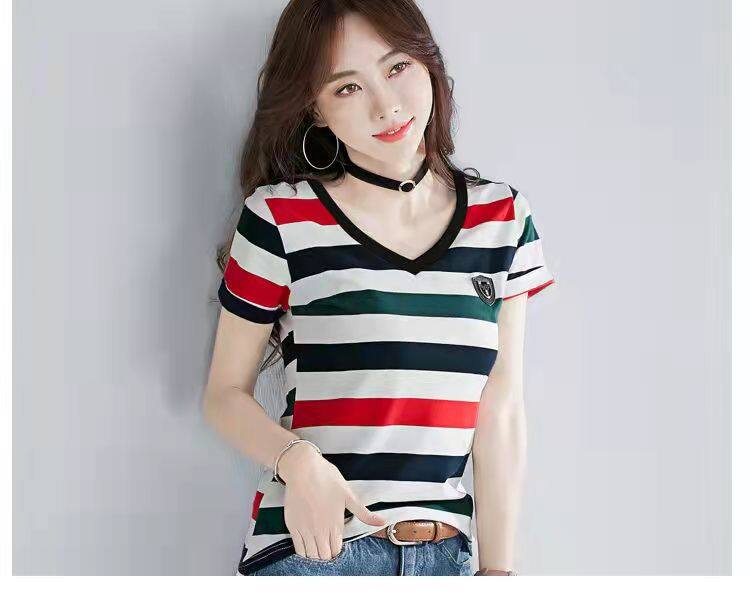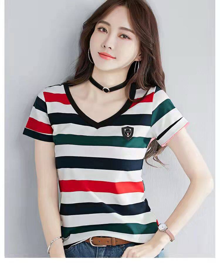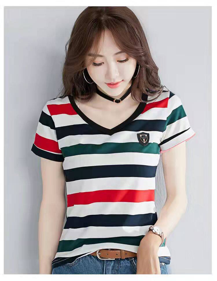 100%全棉韩国新款时尚女士全棉短袖条纹T恤女士修身大码V领半袖T恤夏季上衣