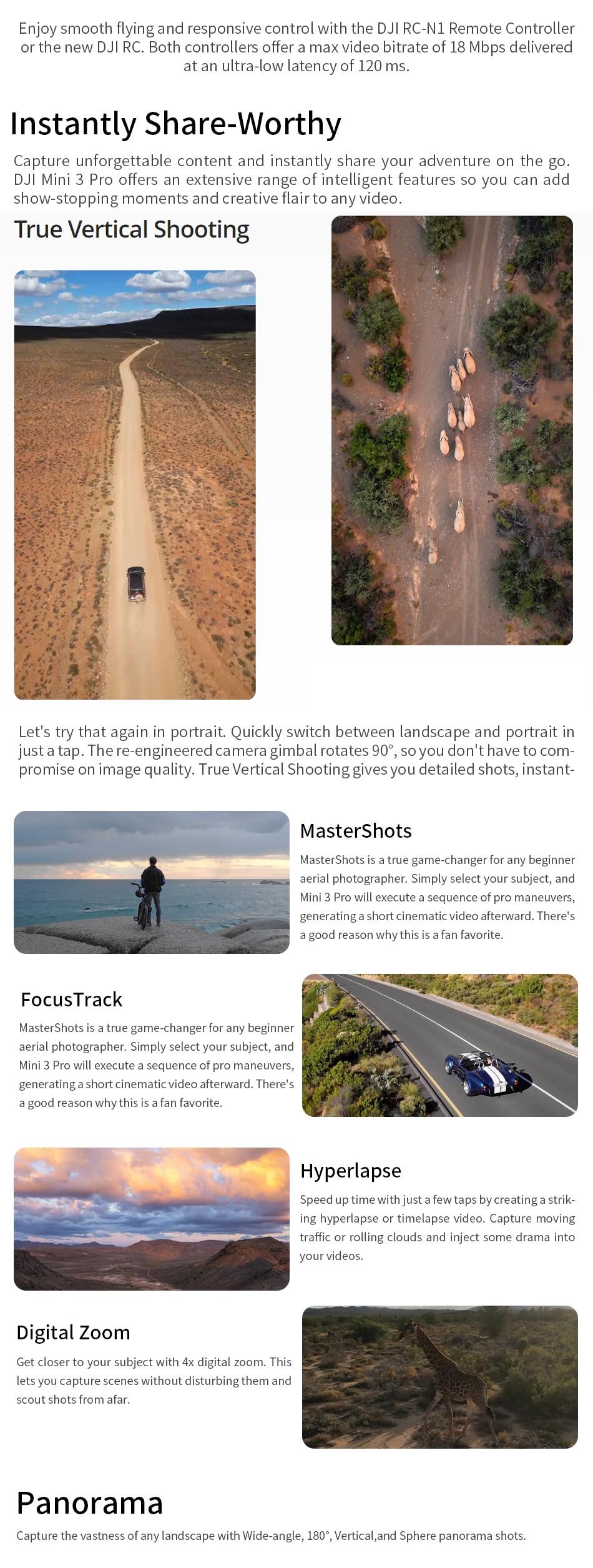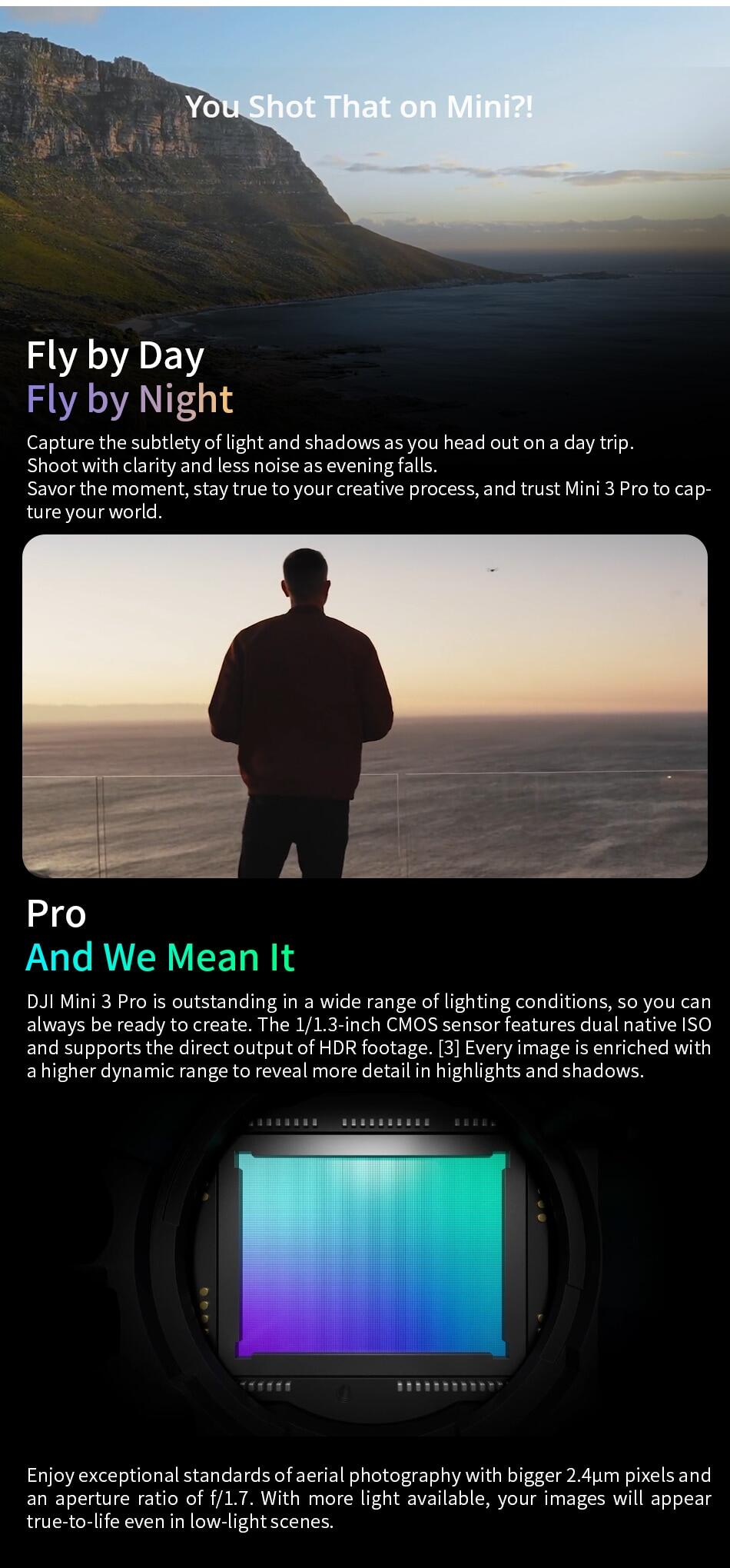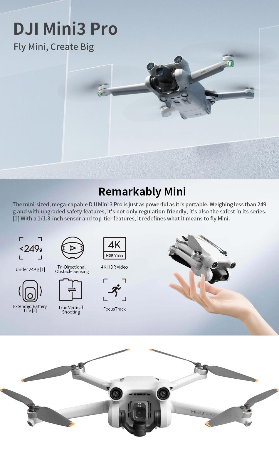 Specifically: Inheriting the 249 g light and compact body, DJI Mini 3 Pro comes with a 1/1.3-inch image sensor that supports native HDR. It supports three-directional obstacle sensing and the newly upgraded APAS 4.0 (Advanced Pilot Assistance Systems). It supports DJI O3 FHD digital video transmission, ensuring a stable live feed at distances of up to 12 km. DJI Mini 3 Pro also supports intelligent features like FocusTrack, True Vertical Shooting, Timelapse, MasterShots, and High-Speed QuickTransfer.
