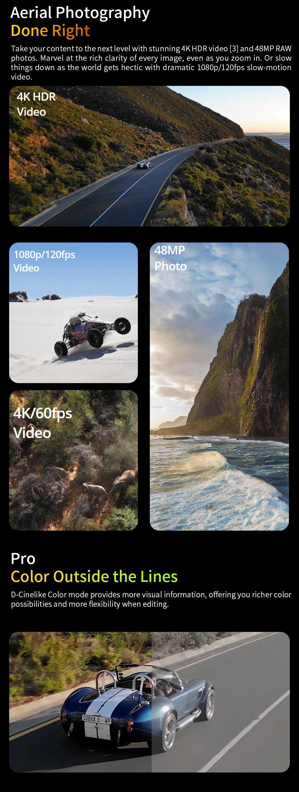 1. Longer flight time at the same compact size: The new form and design allow the drone to carry larger propellers and improve the propulsion efficiency of the propellers and the aircraft, bringing longer flight time.